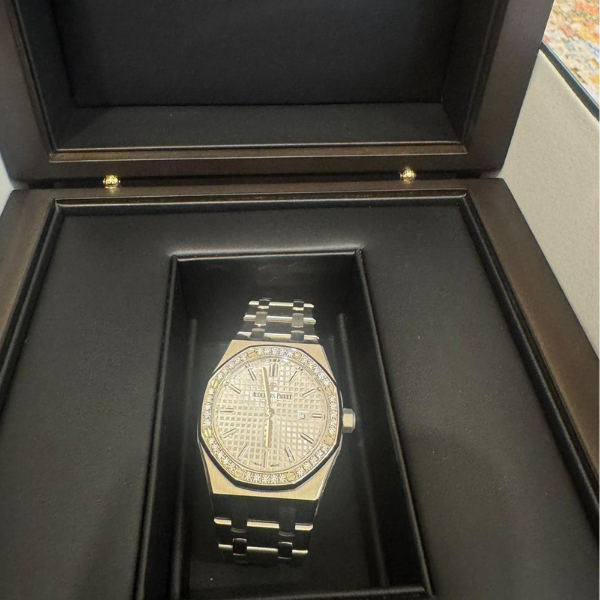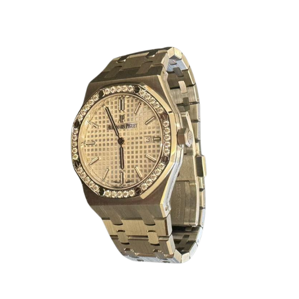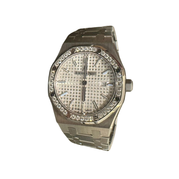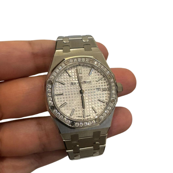Audemars Piguet Royal Oak 33mm stainless steel diamond-set quartz wristwatch with date.