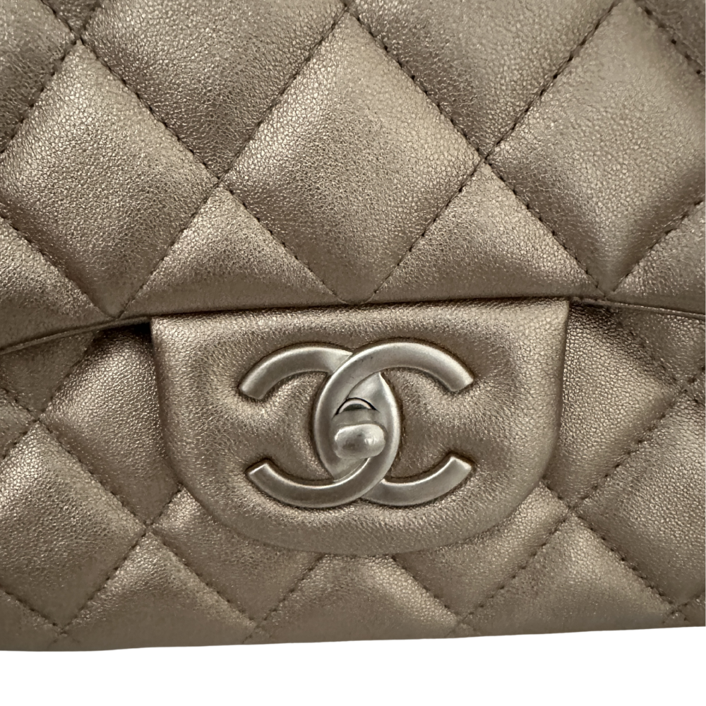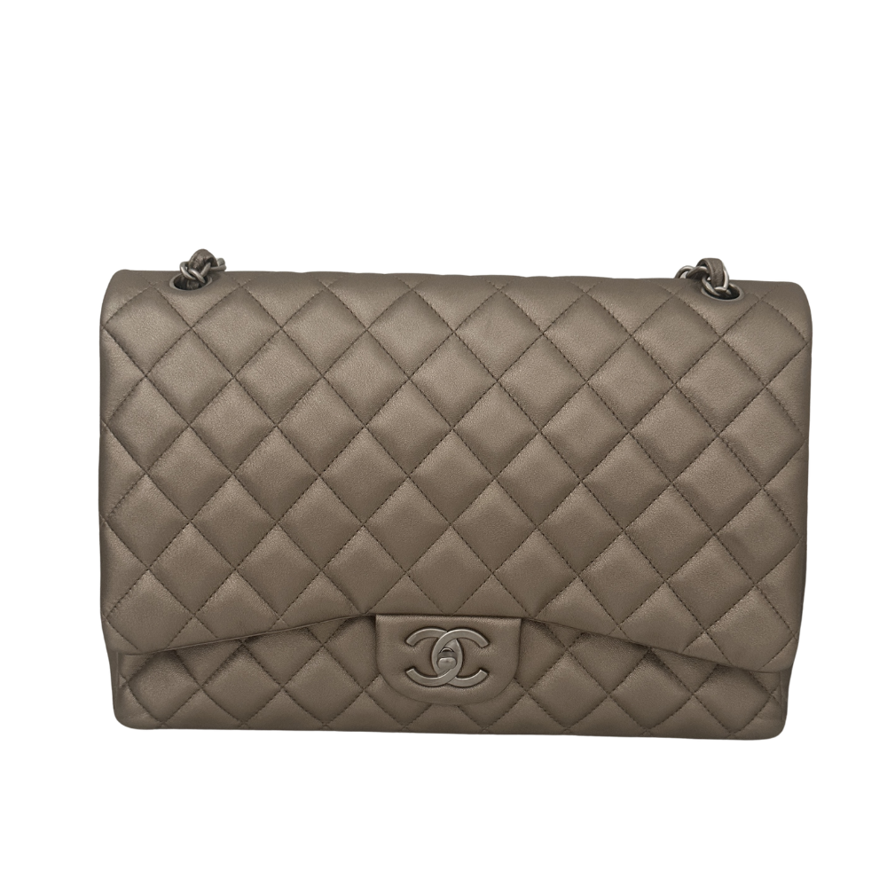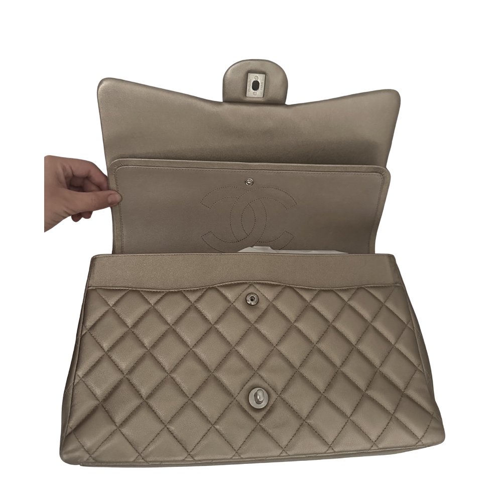 Chanel Classic Double Flap • Color: Beige • Material: Metallic Leather • Size: Maxi • Condition: Excellent • Place of Purchase: Dubai • Accessories Included: Dust bag, authenticity and care cards