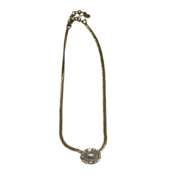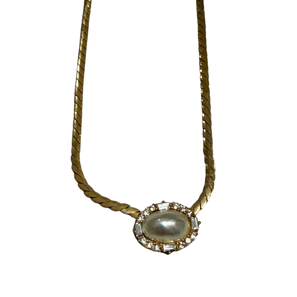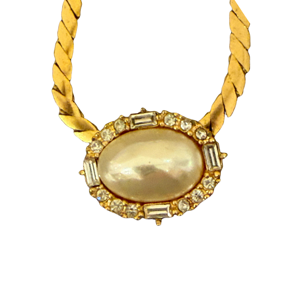 100% Authentic Christian Dior Vintage Faux Pearl Oval with Crystal Gold Plated Pendant Necklace.