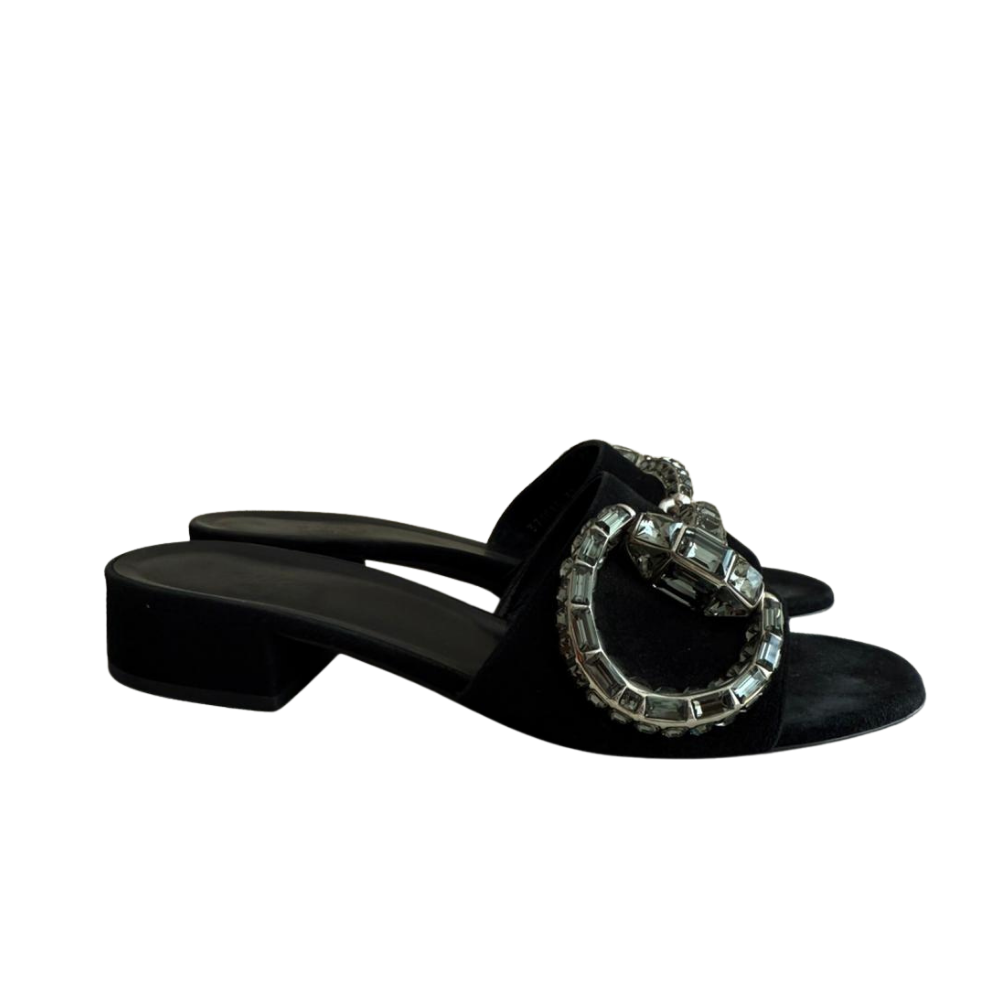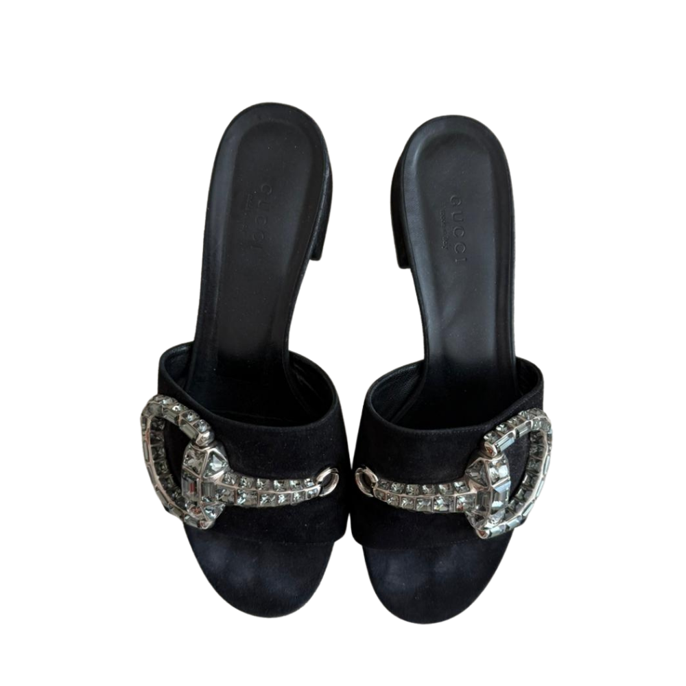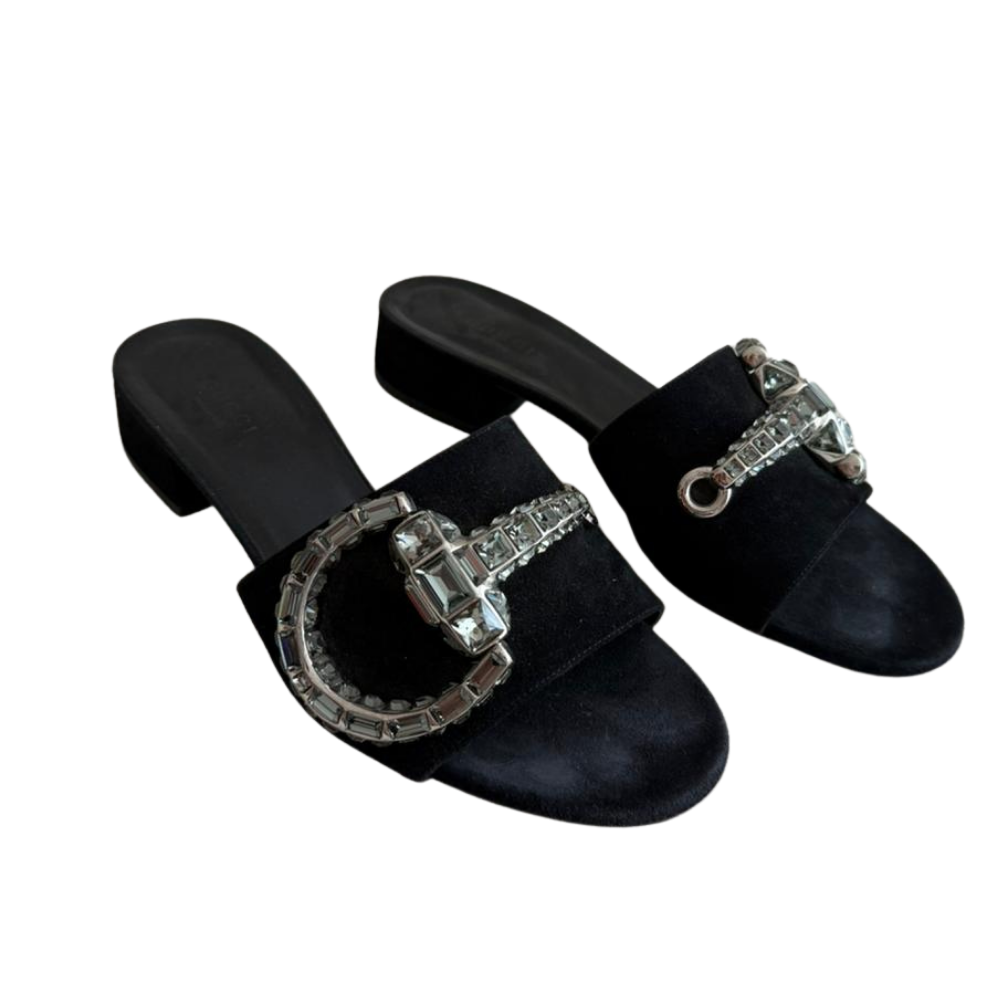 GucciMaxime Crystal Horsebit Suede Slide Sandals Black 37
