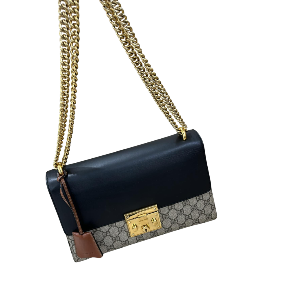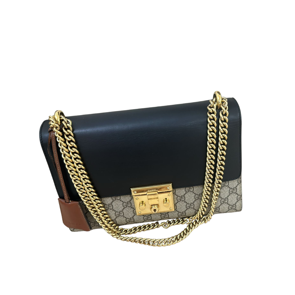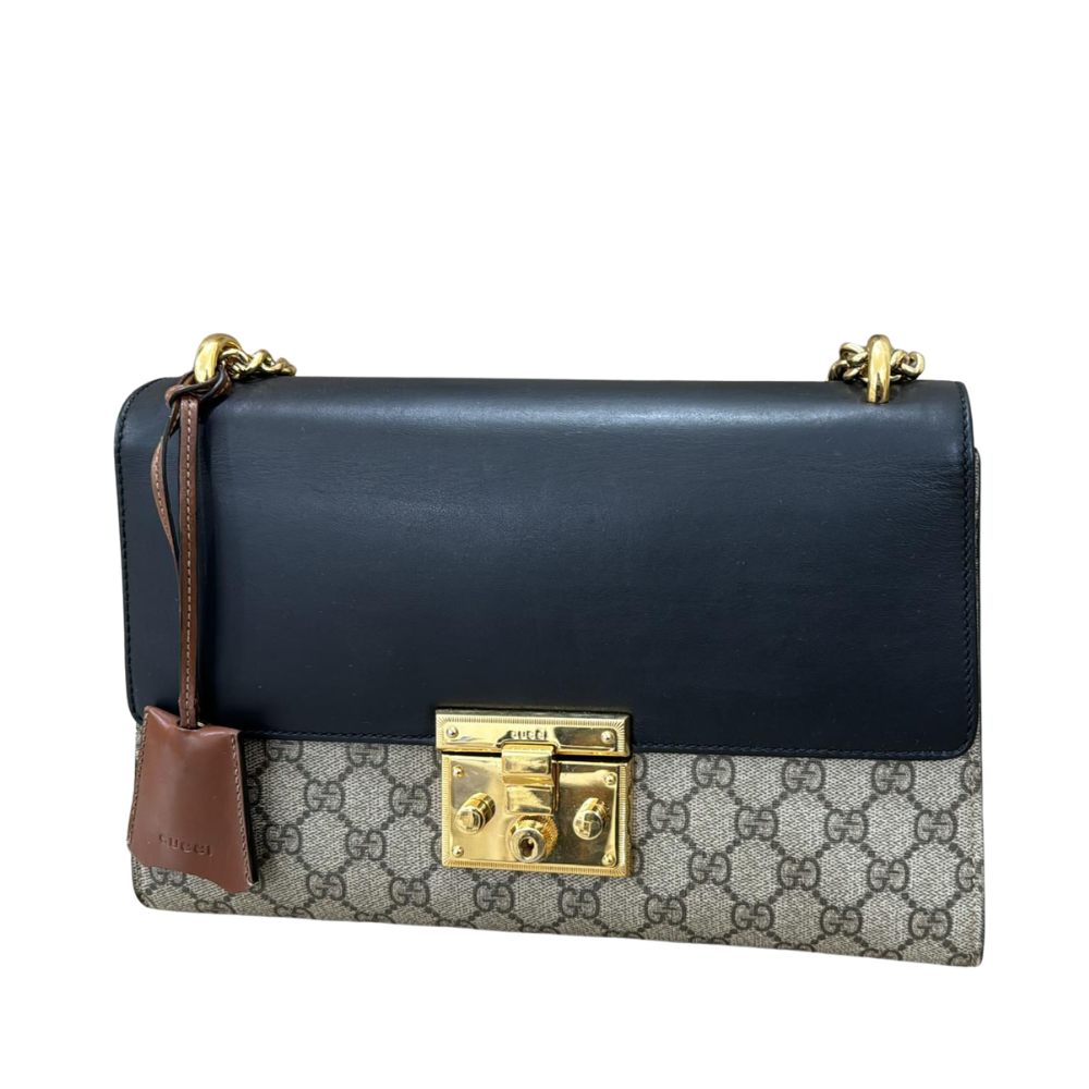 GG Supreme Monogram Calfskin Small Padlock Shoulder Bag Beige Black Cuir