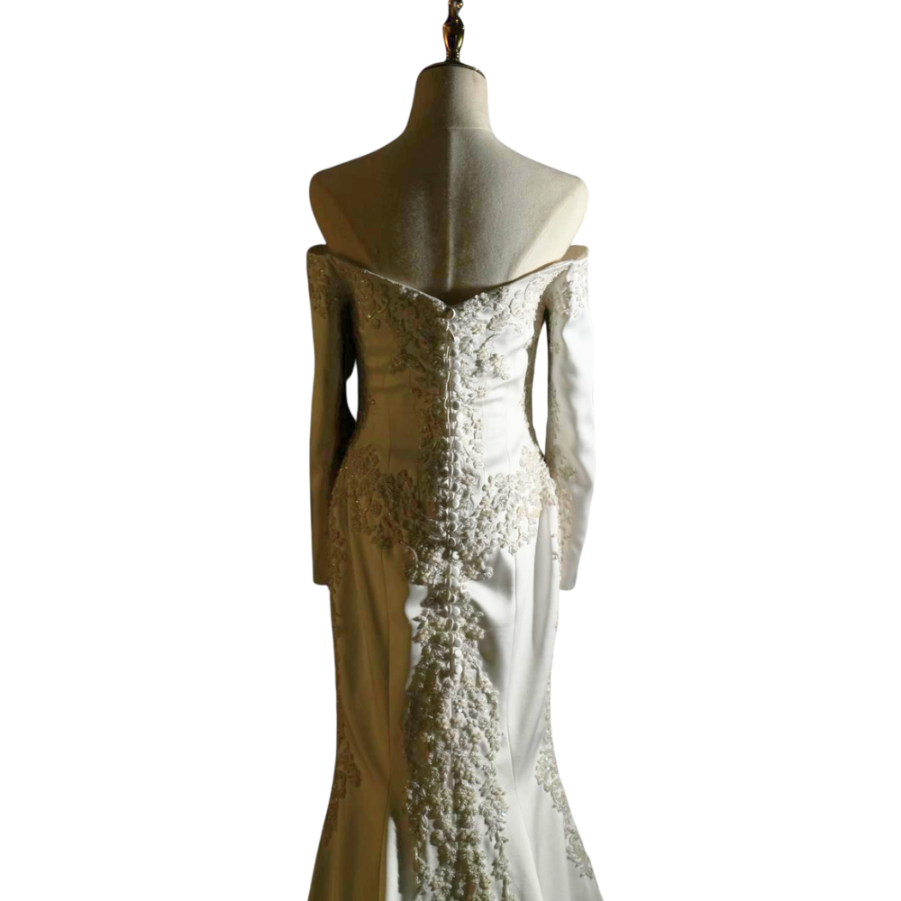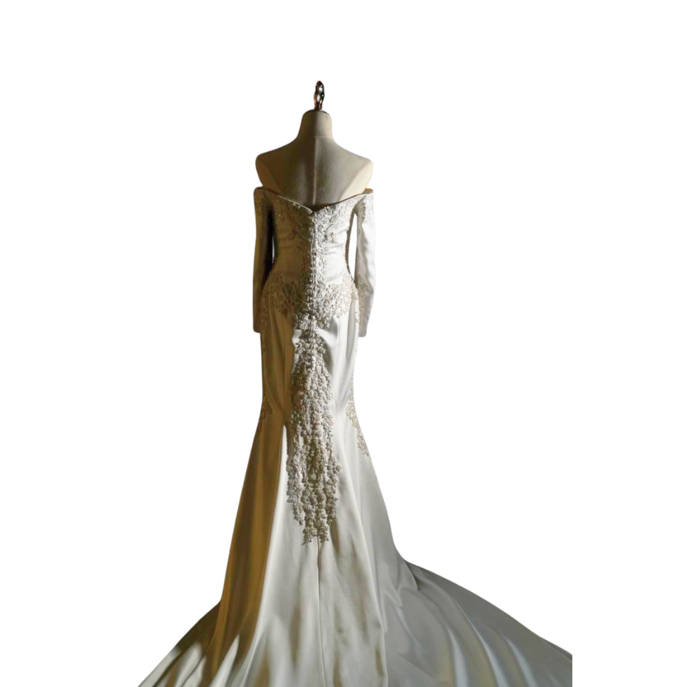 Accessories: Dress and veil, including a matching bouquet ribbon set featuring the same designer pattern.