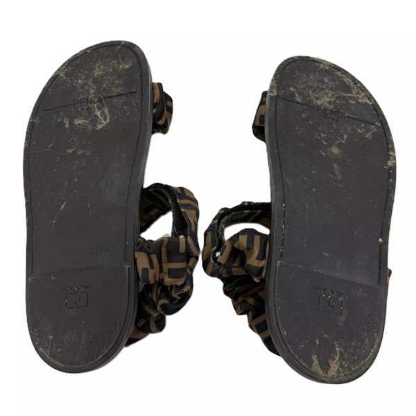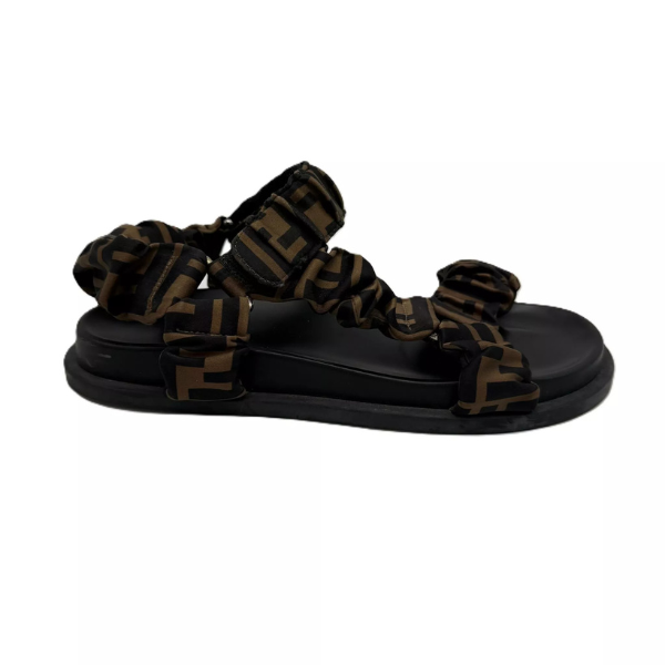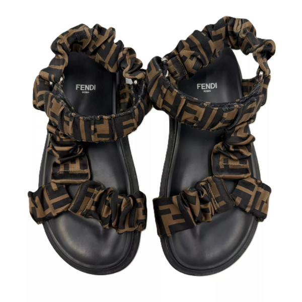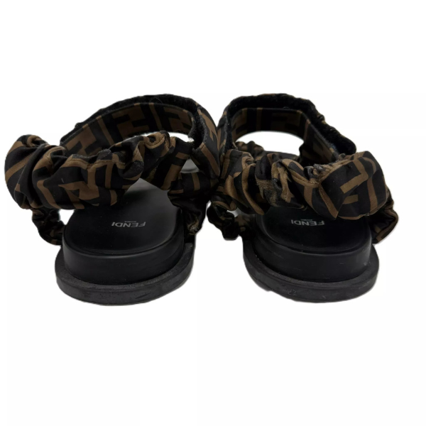 Fendi's sandals showcase the signature FF monogram. This sporty pair boasts ruched satin straps.Item Condition: The item in very good condition with signs of wear on the sole.