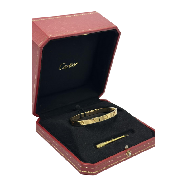 Cartier Love Bracelet – Yellow Gold Condition: Used Size: 18 (Wide Model) Includes: Box + Warranty Card