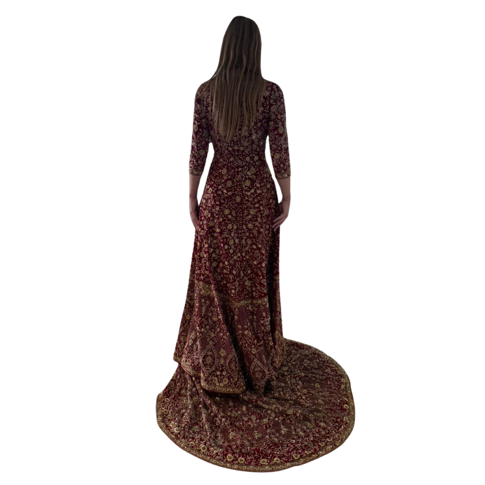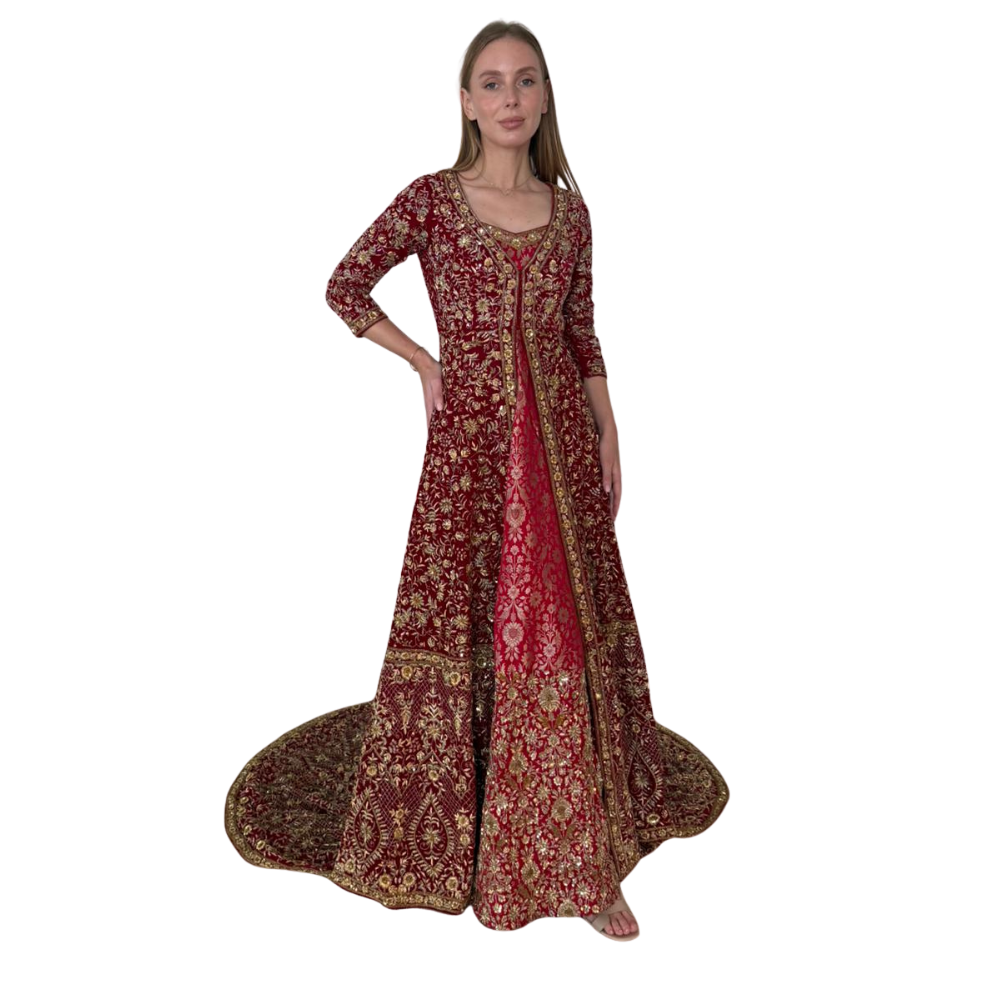 Henna night dress design, handmade embroiderySize: SmallWorn onceAccessories: dress + jacket (cape) + removable train + red veilColor: red velvet with gold embroideryPlace of purchase: India