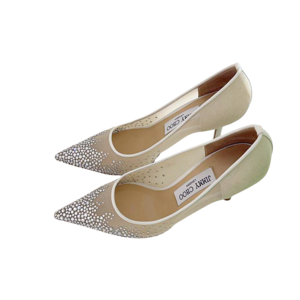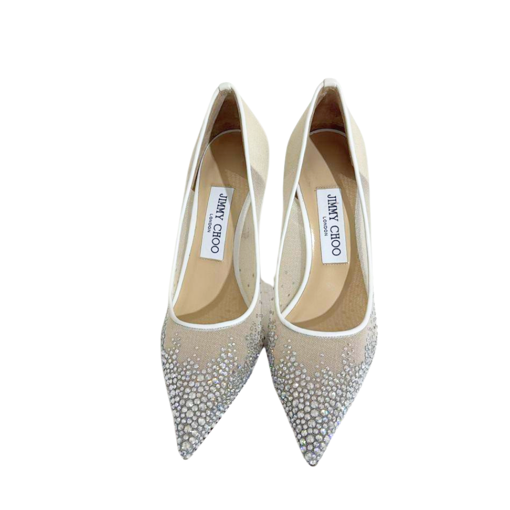 Jimmy Choo White Mesh Pointed-Toe Pumps with Dégradé Crystals Color: White / Crystal