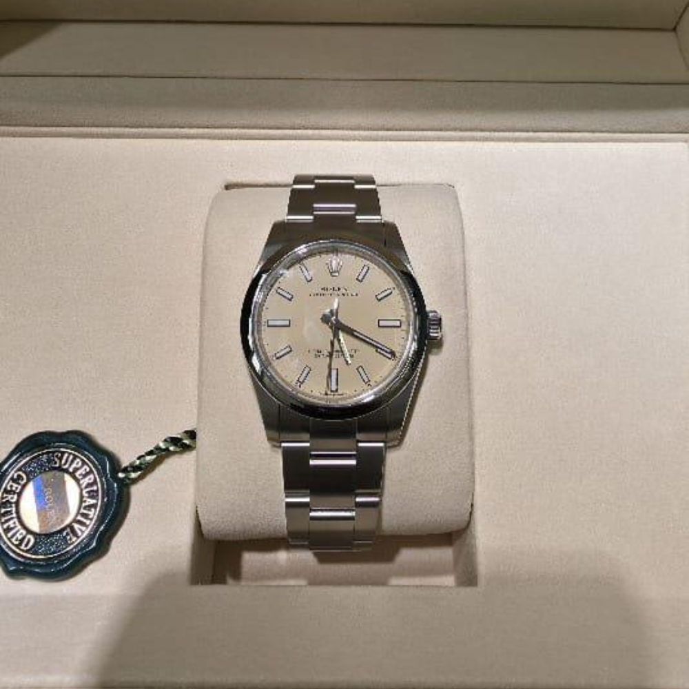 Rolex Rolex Oystersteel – Beige Dial – Oystersteel Bracelet Size: 34 mm Condition: Brand new Dial color: Beige Year of purchase: 2025Includes: Full set of accessories