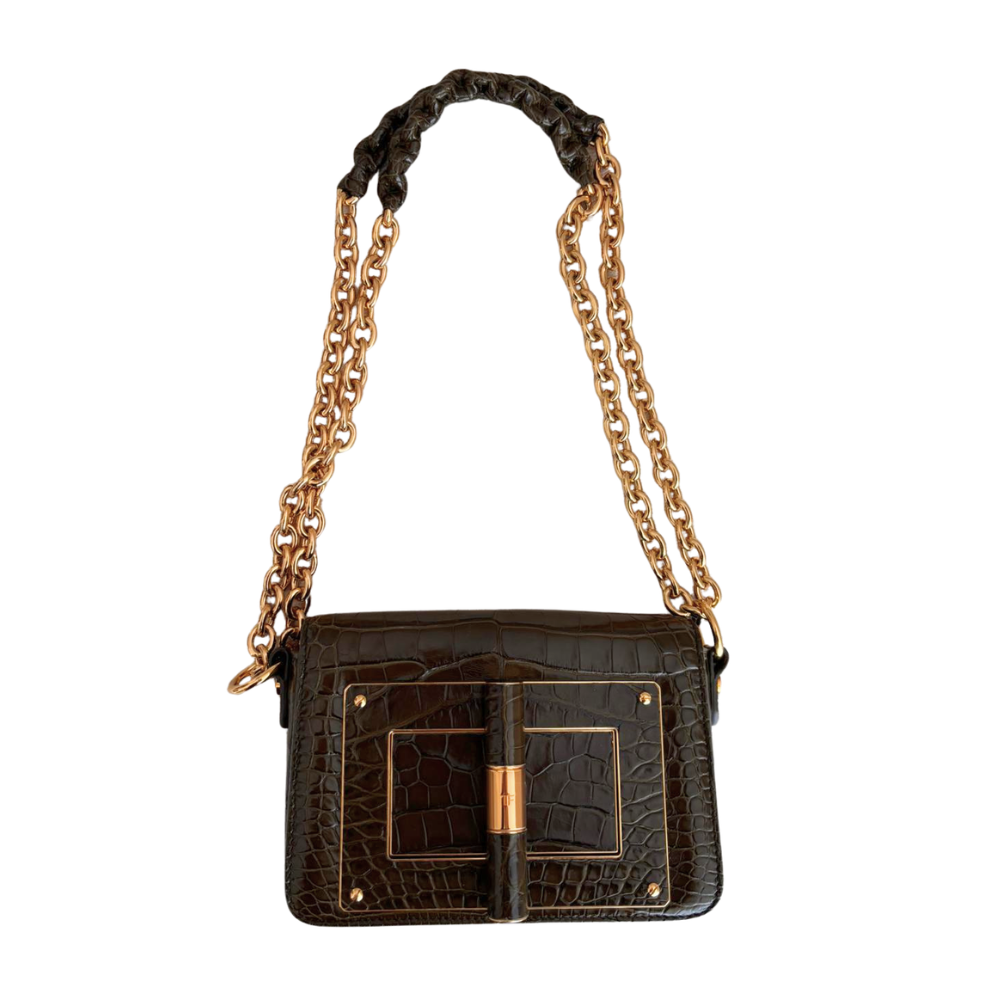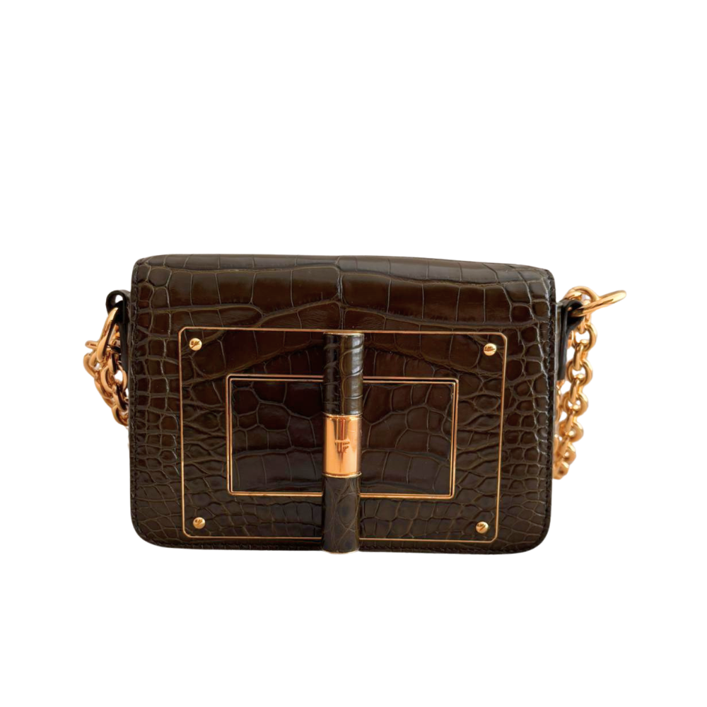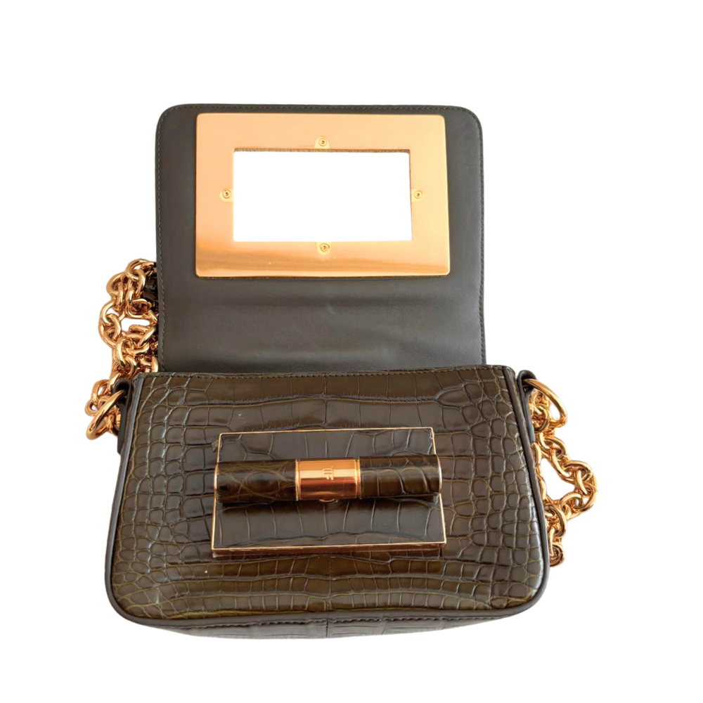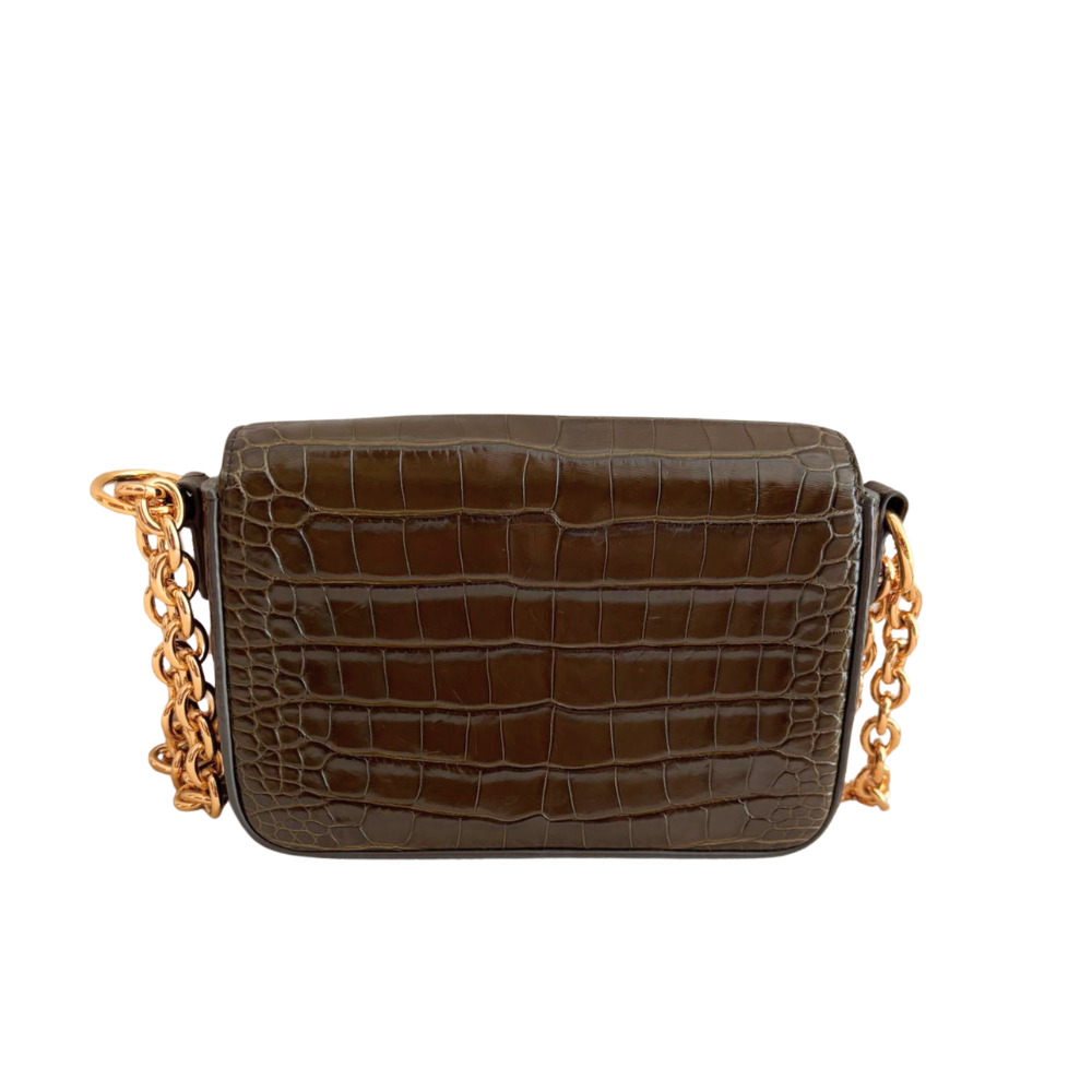 green leather cross-body bag with crocodile embossing