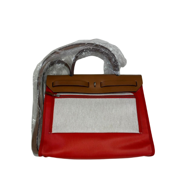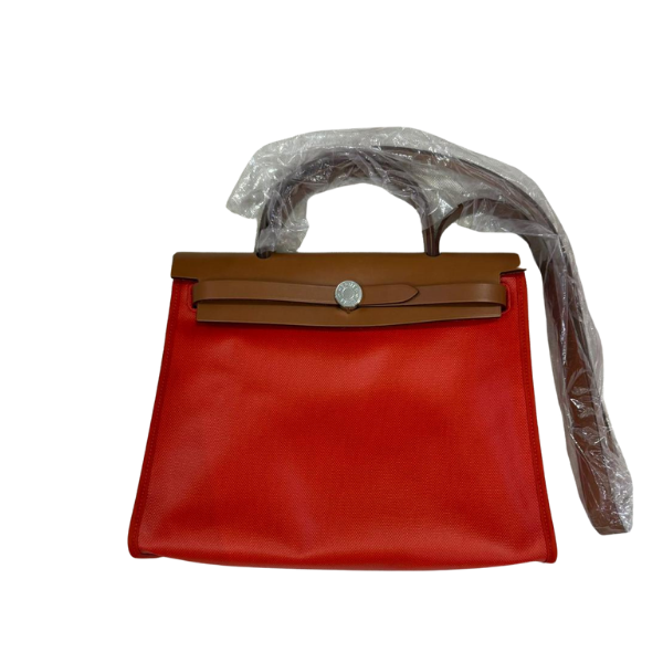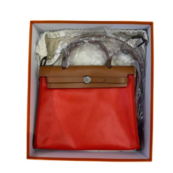 HERMES HERBAG 31 WITH BERLINE CANVAS AND HUNTER ORANGE MECANO/ECRU- BEIGE