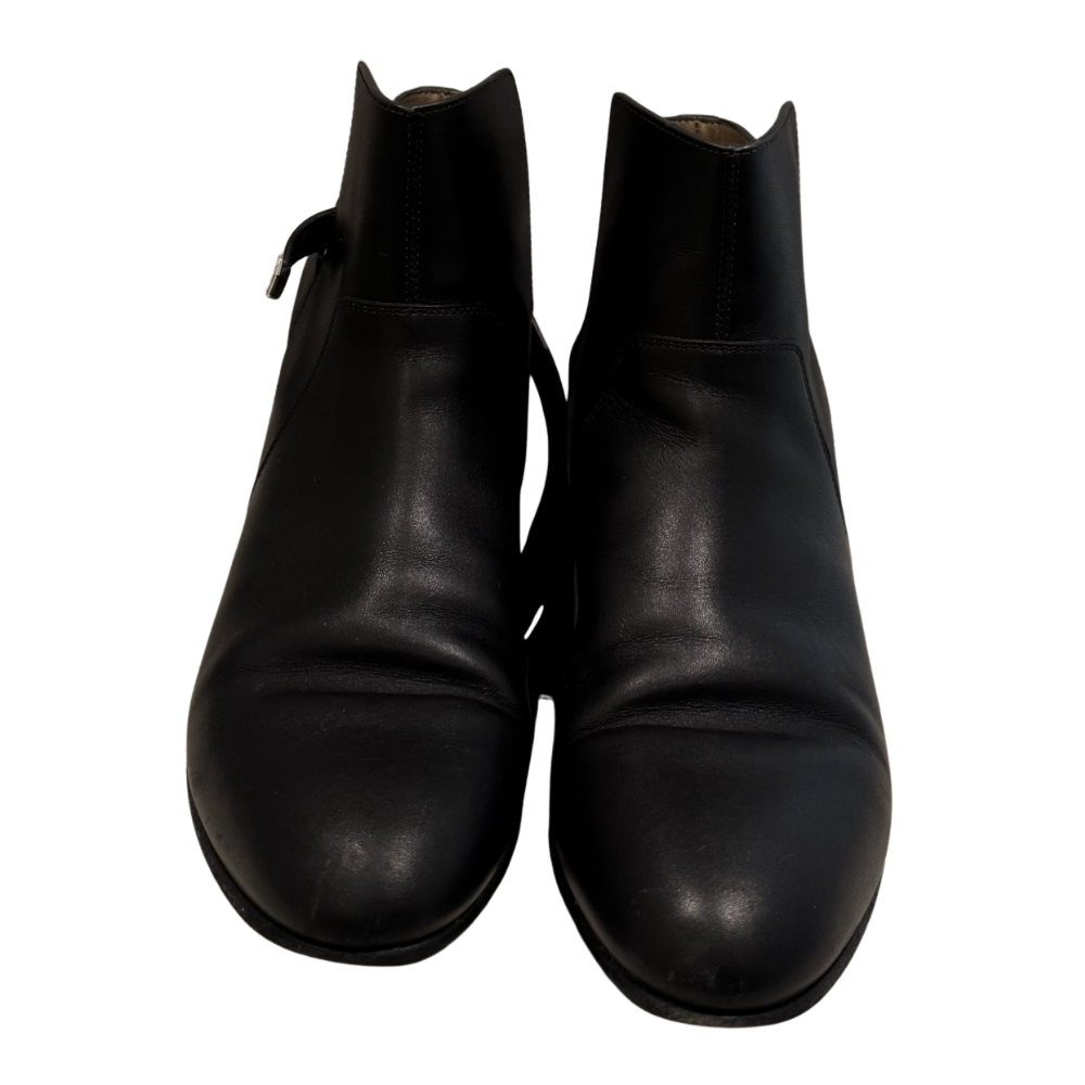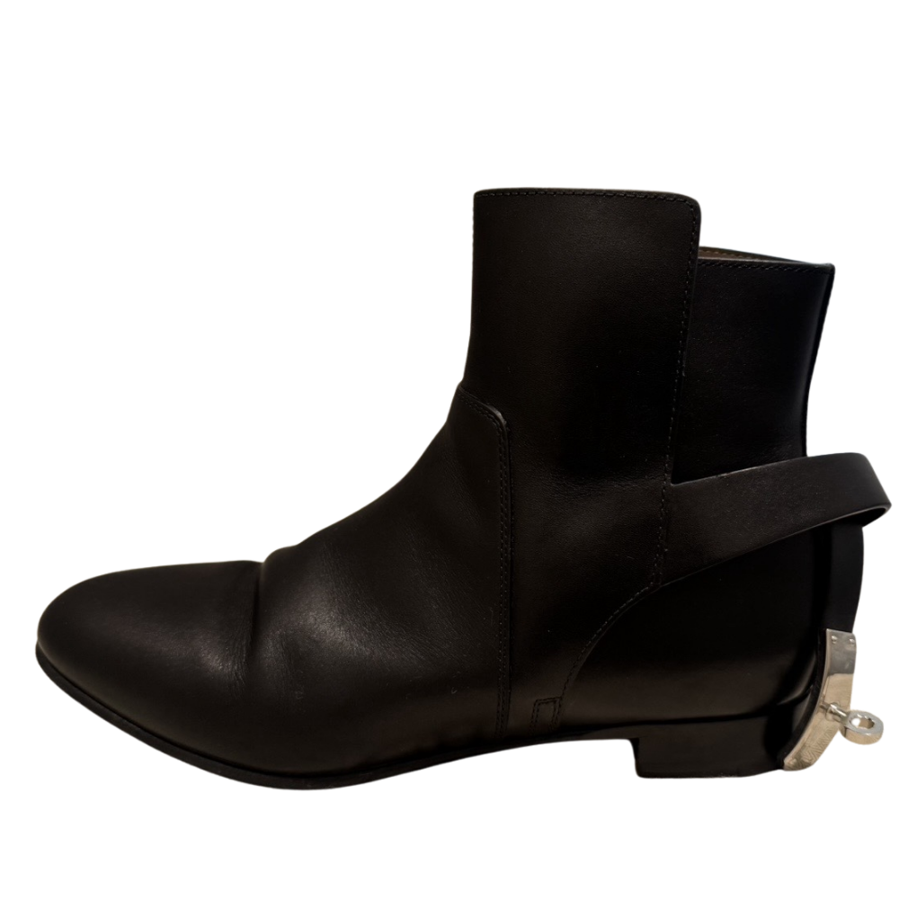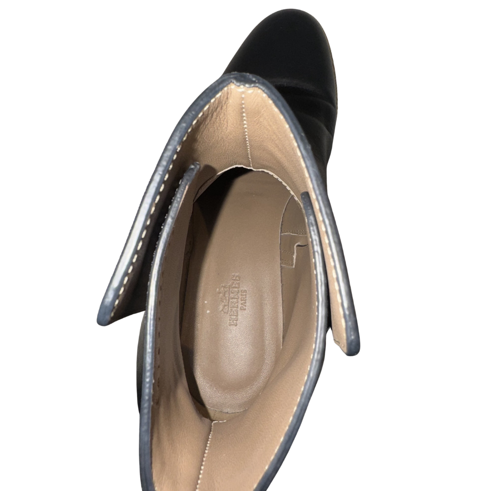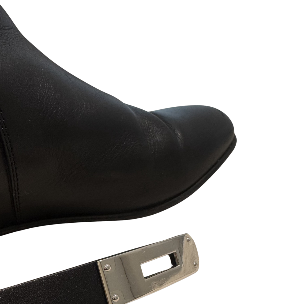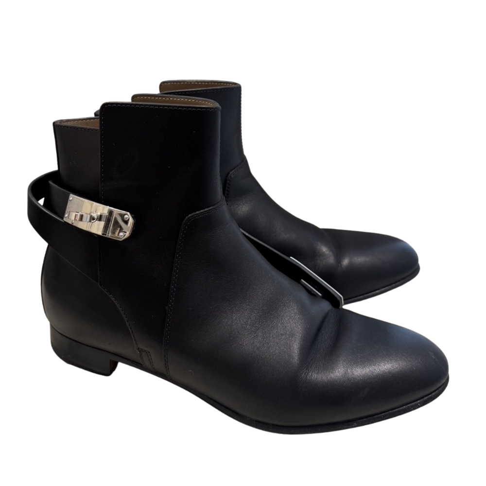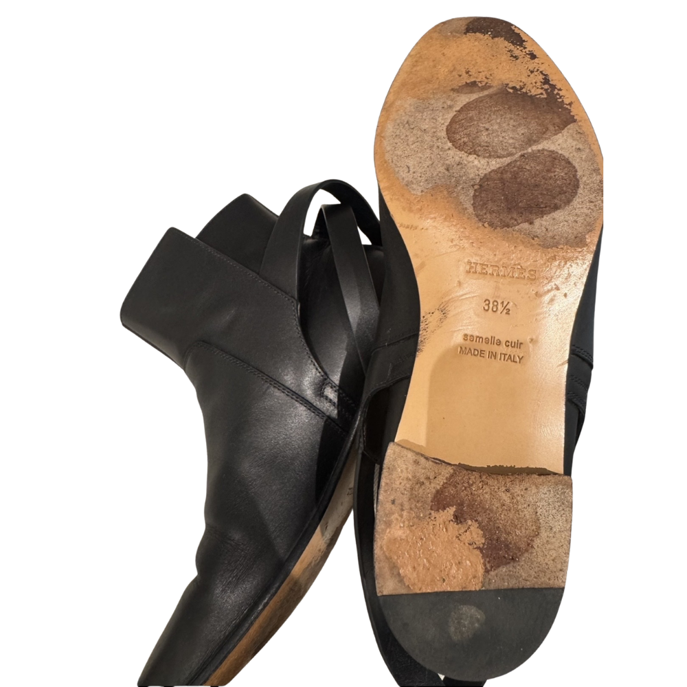 Hermès Neo Ankle Boots in Black, Size 38.5. Includes original box and dust bags. Pre-loved condition with visible wear to soles from normal use. Clean interior. Hardware protective film still attached. No receipt available.