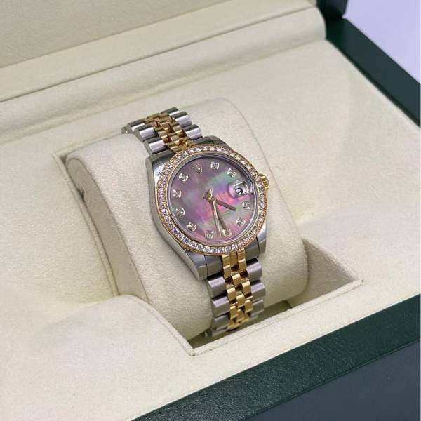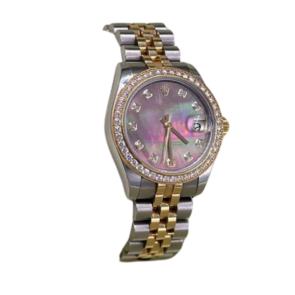 Rolex Condition: Excellent Model: 2011 Size: 31mm Includes: Box + Warranty Card Material: Steel & Yellow Gold Dial: Factory Diamonds with Mother of Pearl