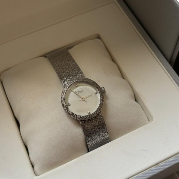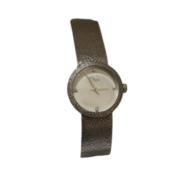 Dior La D de Dior Satine Ø 25 mm, Steel, White Mother-of-Pearl and Diamonds Condition: Excellent Includes all accessories + receipt Purchased from Dior Boutique, Villaggio – Qatar