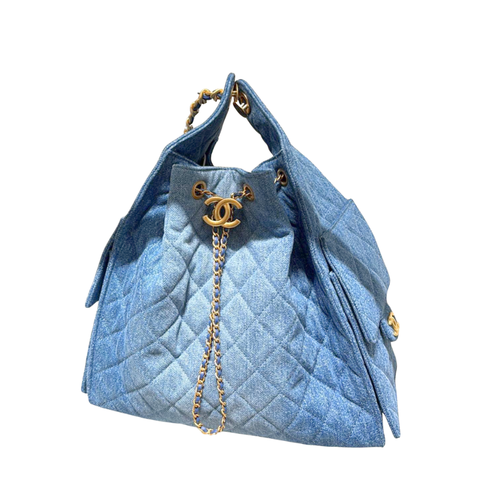 the Chanel 25 Medium Denim Chain Shoulder Bag Blue Gold Metal