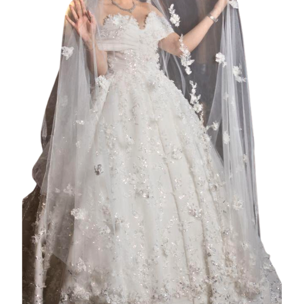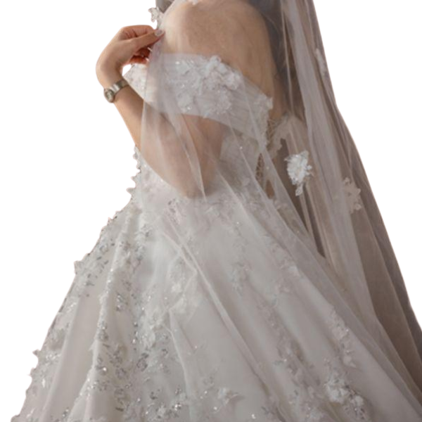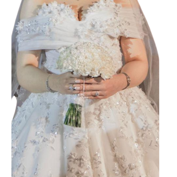 Accessories: Medium petticoat, brand dust bag, veil with extra designed chiffon (flowers) – with option for customer to add more and customize
