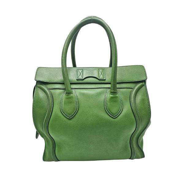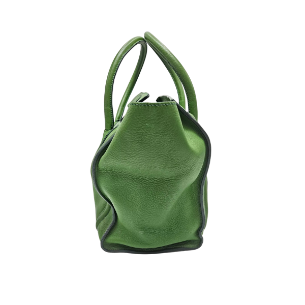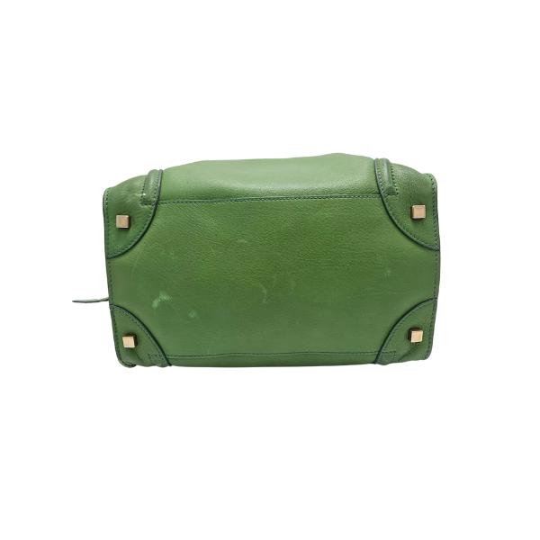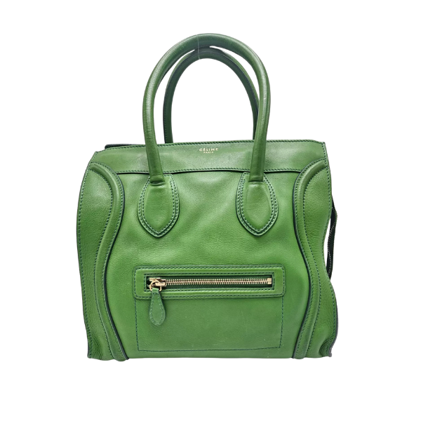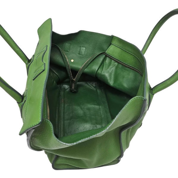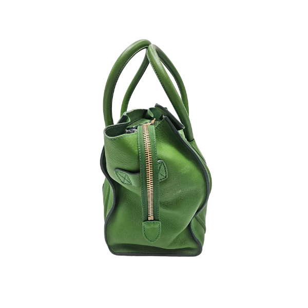 Condition: Good, Minor discoloration and scuff marksColor: Green leather Front zipper pocket Dual top handlesHardware: Gold-tone hardware Signature winged sides Brand logo on frontDimensions: 30 × 15 × 31 cm