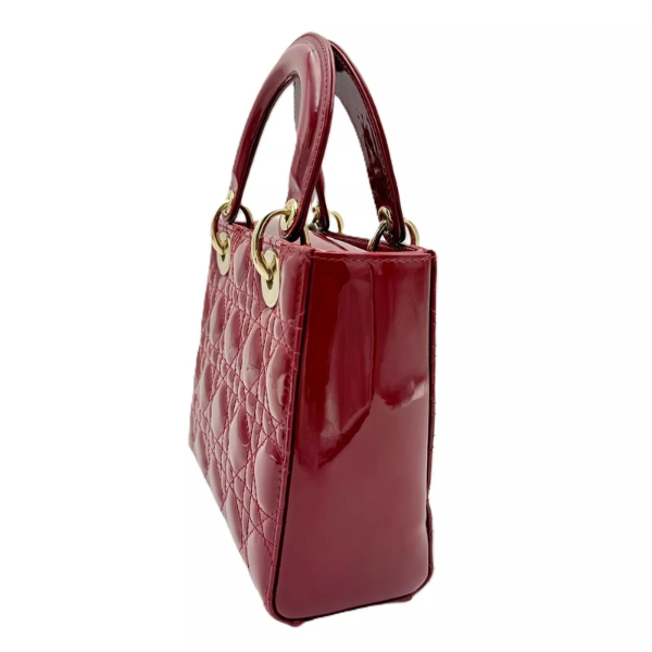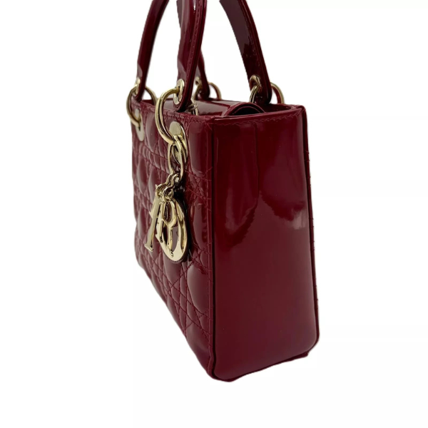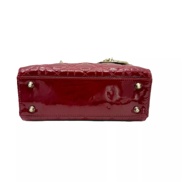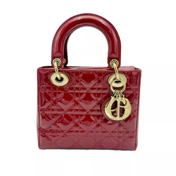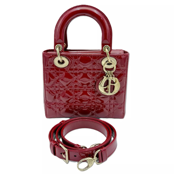 The Lady Dior bag epitomizes the House's vision of elegance and beauty. Sleek and refined, the timeless style is crafted in cherry red patent calfskin with Cannage stitching, creating the instantly recognizable quilted texture. Pale gold-finish metal signature D.I.O.R. charms embellish and illuminate its silhouette. Featuring a thin, removable leather shoulder strap, the small Lady Dior bag can be carried by hand or worn crossbody.Item Condition: Very good condition
