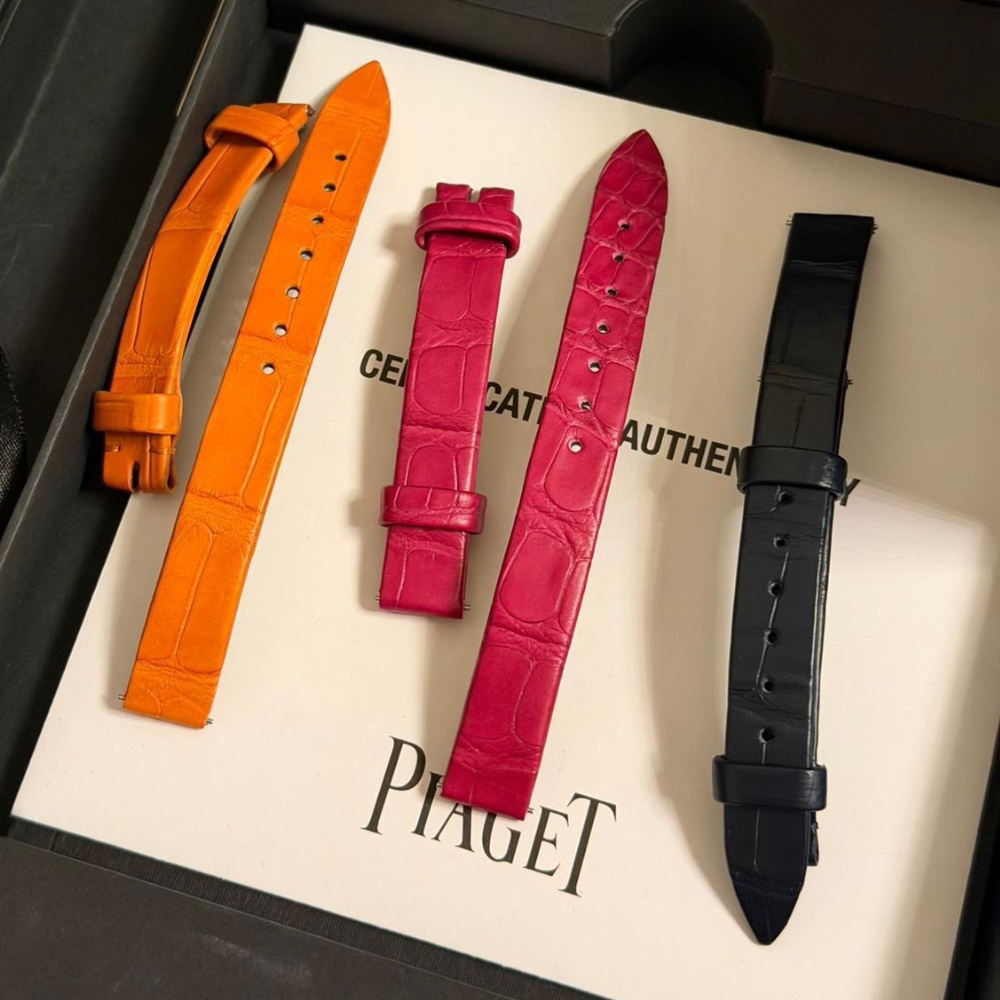 Accessories: All accessories included — box, case, warranty card, certificate, and the original navy strap plus additional straps (orange, fuchsia, light pink).