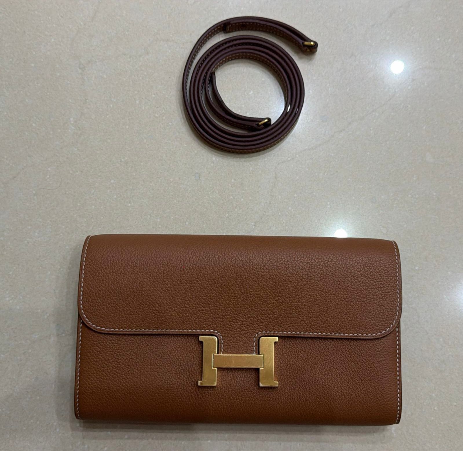 Hermès Constance To Go Wallet Color: Camel Hardware: Gold Leather: Evercolor Condition: New