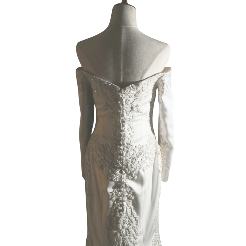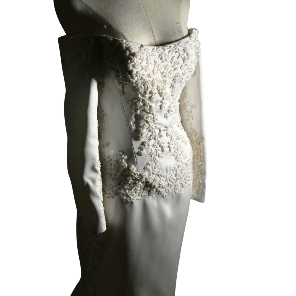 Accessories: Dress and veil, including a matching bouquet ribbon set featuring the same designer pattern.