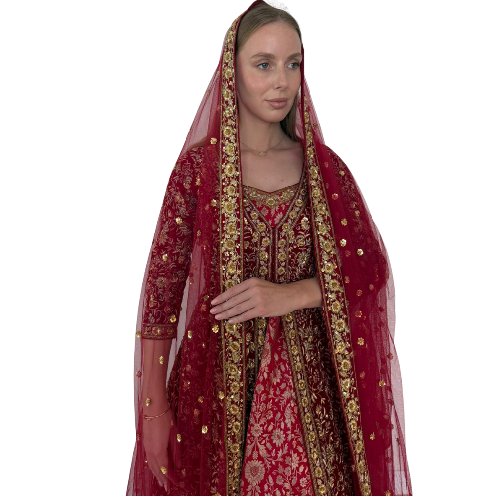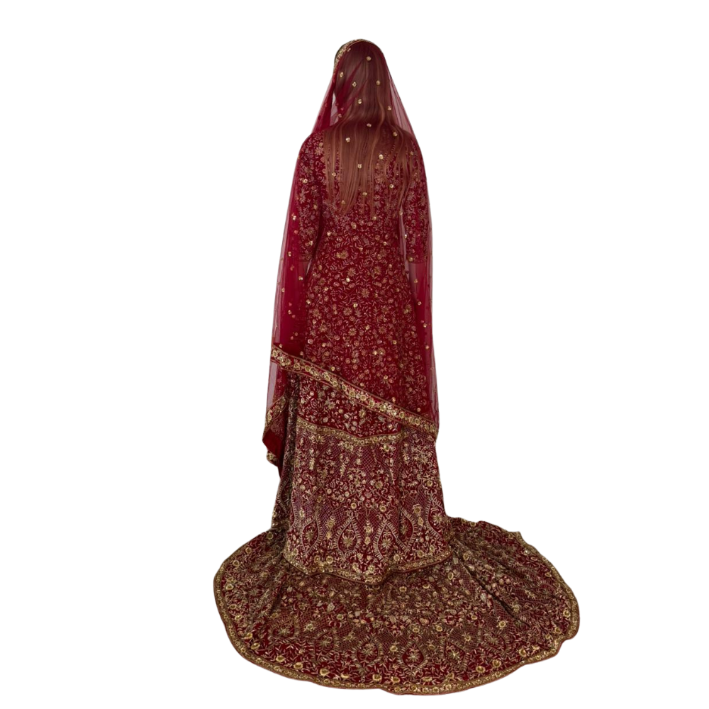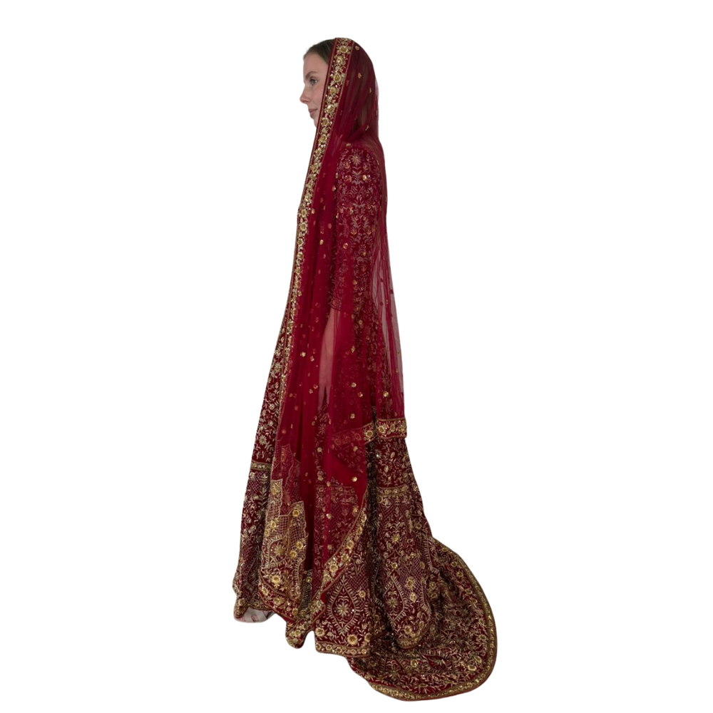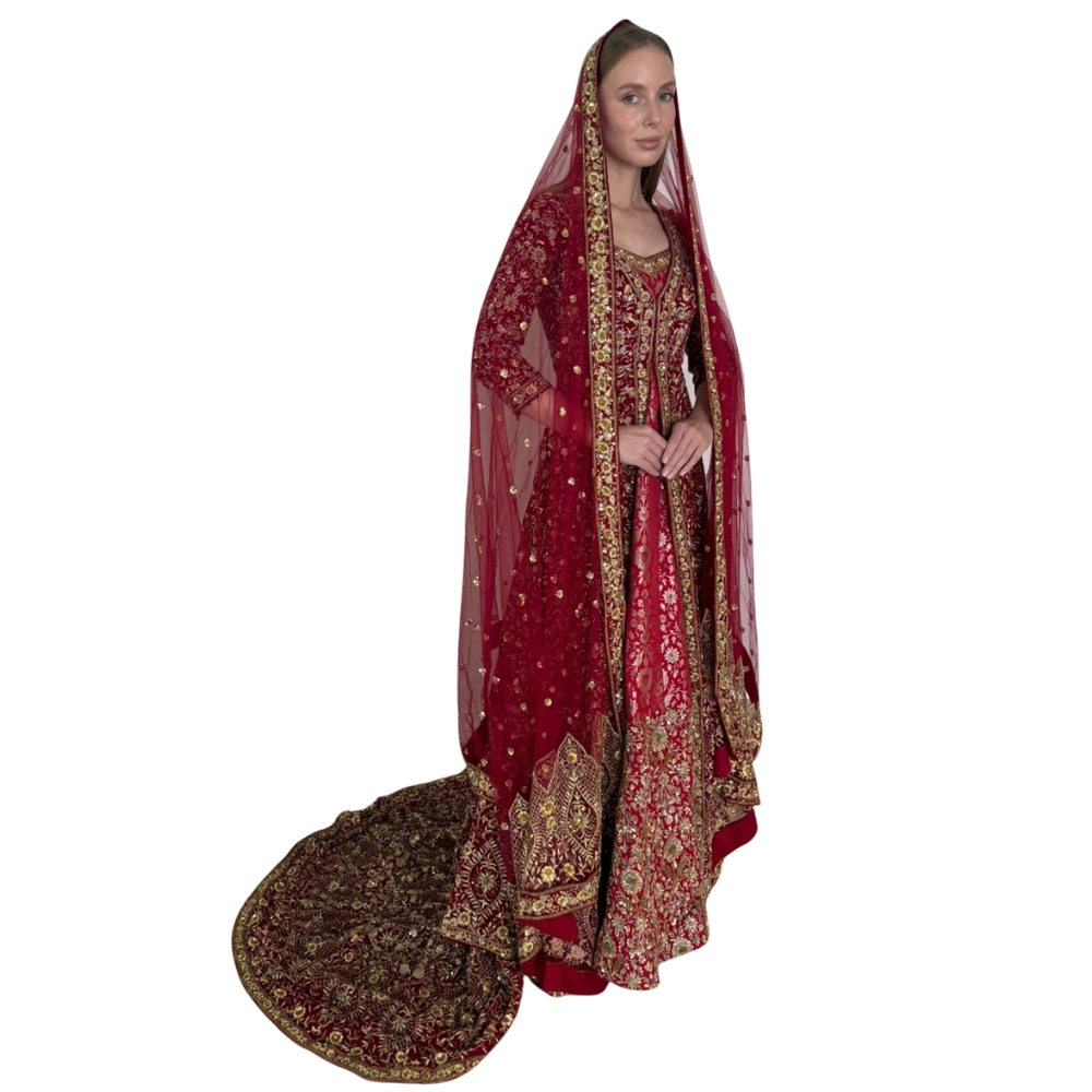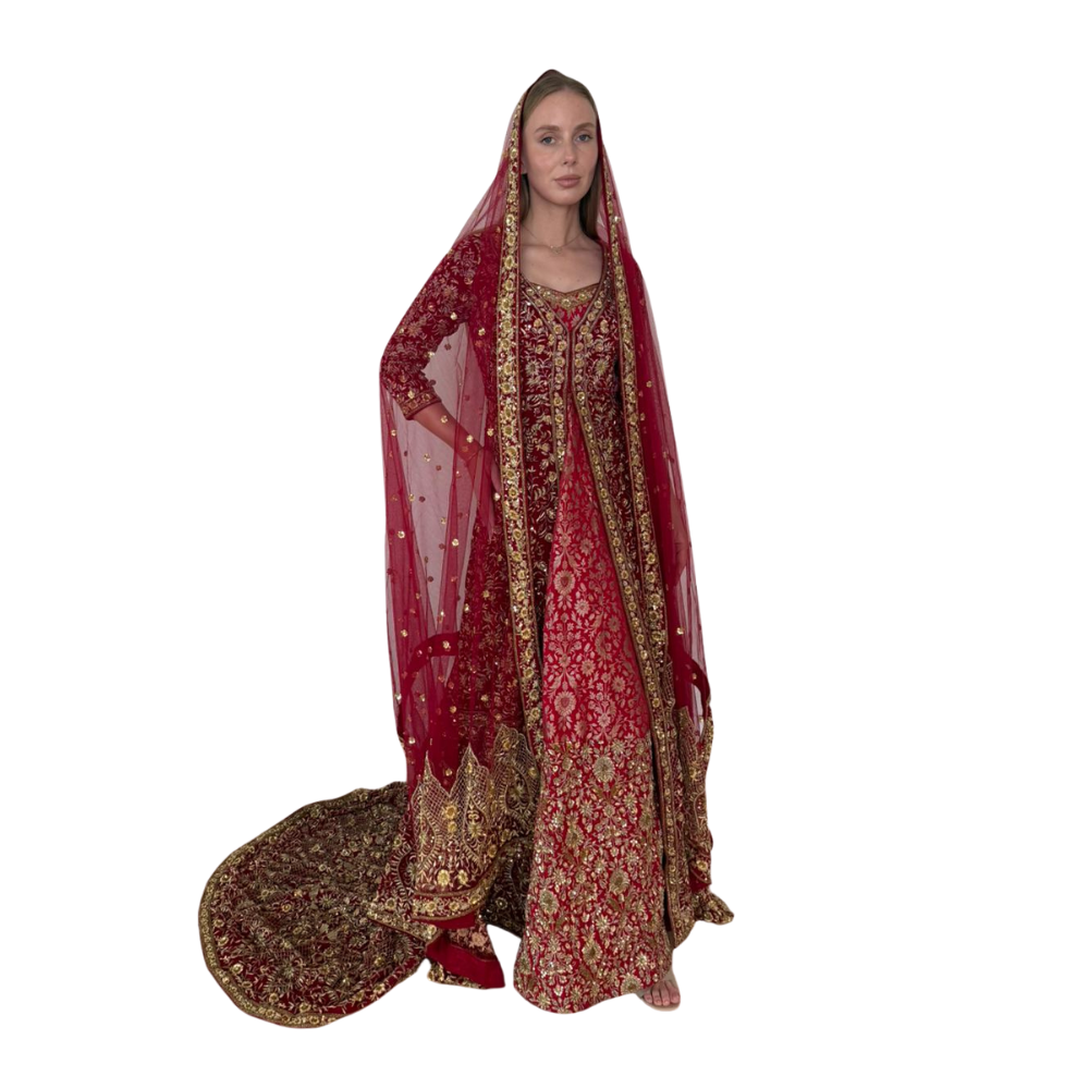 Henna night dress design, handmade embroiderySize: SmallWorn onceAccessories: dress + jacket (cape) + removable train + red veilColor: red velvet with gold embroideryPlace of purchase: India