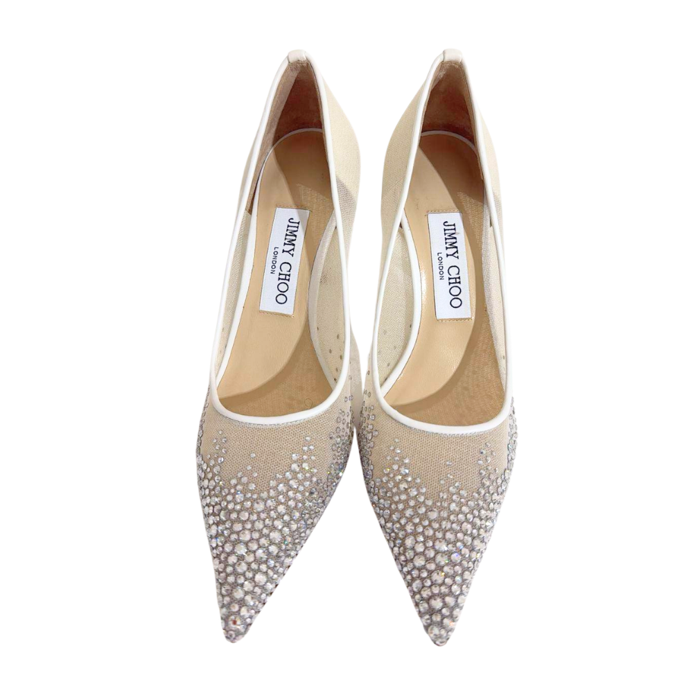 Jimmy Choo White Mesh Pointed-Toe Pumps with Dégradé Crystals Color: White / Crystal
