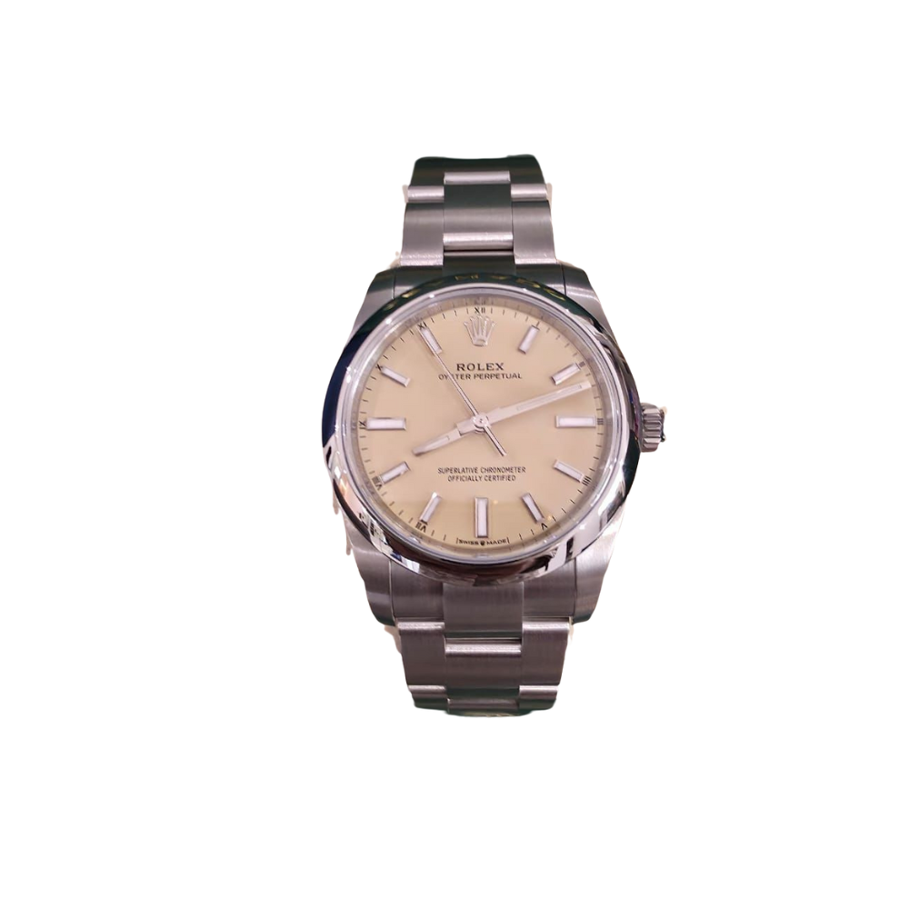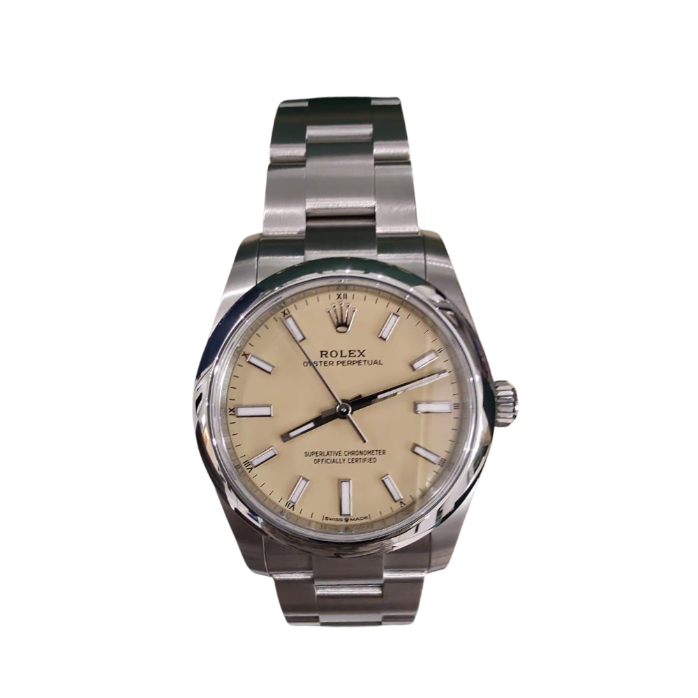 Rolex Rolex Oystersteel – Beige Dial – Oystersteel Bracelet Size: 34 mm Condition: Brand new Dial color: Beige Year of purchase: 2025Includes: Full set of accessories