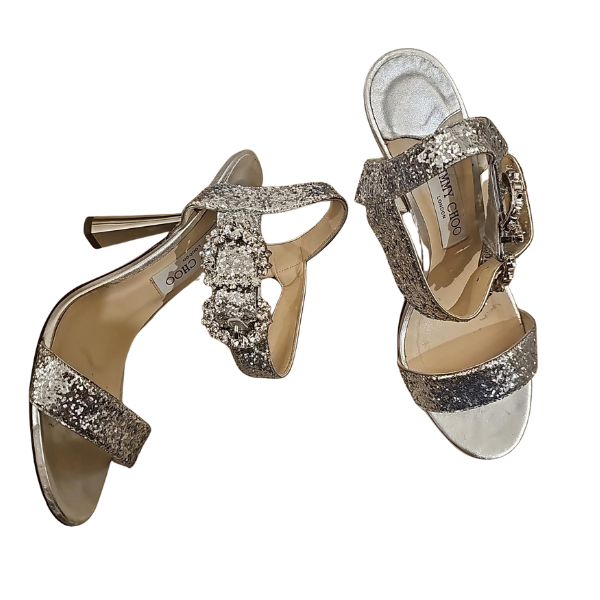 Jimmy Choo Silver Glitter Ankle Strap Heels Size: 40 Condition: Excellent Accessories: Box + Dust Bag