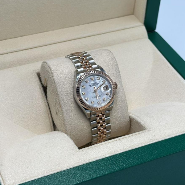 Rolex Material: Steel & Rose Gold Dial: Mother of Pearl with Diamond Markers Size: 28mm Model: 2022 Condition: Excellent Includes: Box + Warranty Card