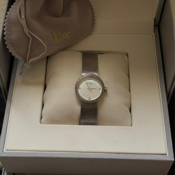 Dior La D de Dior Satine Ø 25 mm, Steel, White Mother-of-Pearl and Diamonds Condition: Excellent Includes all accessories + receipt Purchased from Dior Boutique, Villaggio – Qatar