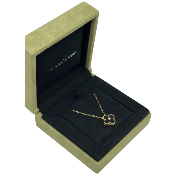 Limited Edition Van Cleef & Arpels 18K Rose Gold Diamond Black Onyx Vintage Alhambra Pendant Necklace Condition: Pre-owned Accessories: Box only