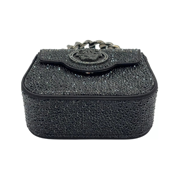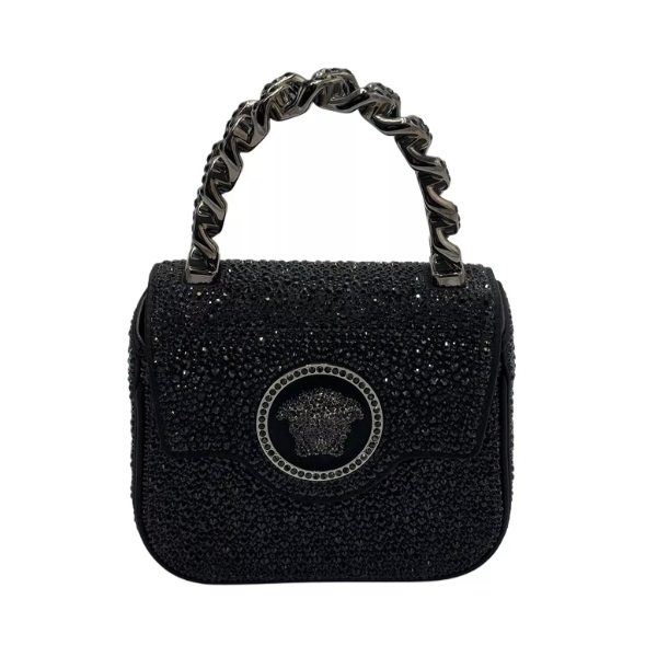Condition: Excellent (like brand new, rarely used) Material: Satin with tonal crystal embellishments Features: Iconic Medusa emblem, fixed-chain top handle, detachable and adjustable shoulder strap Dimensions: 12 × 6 × 16 cm